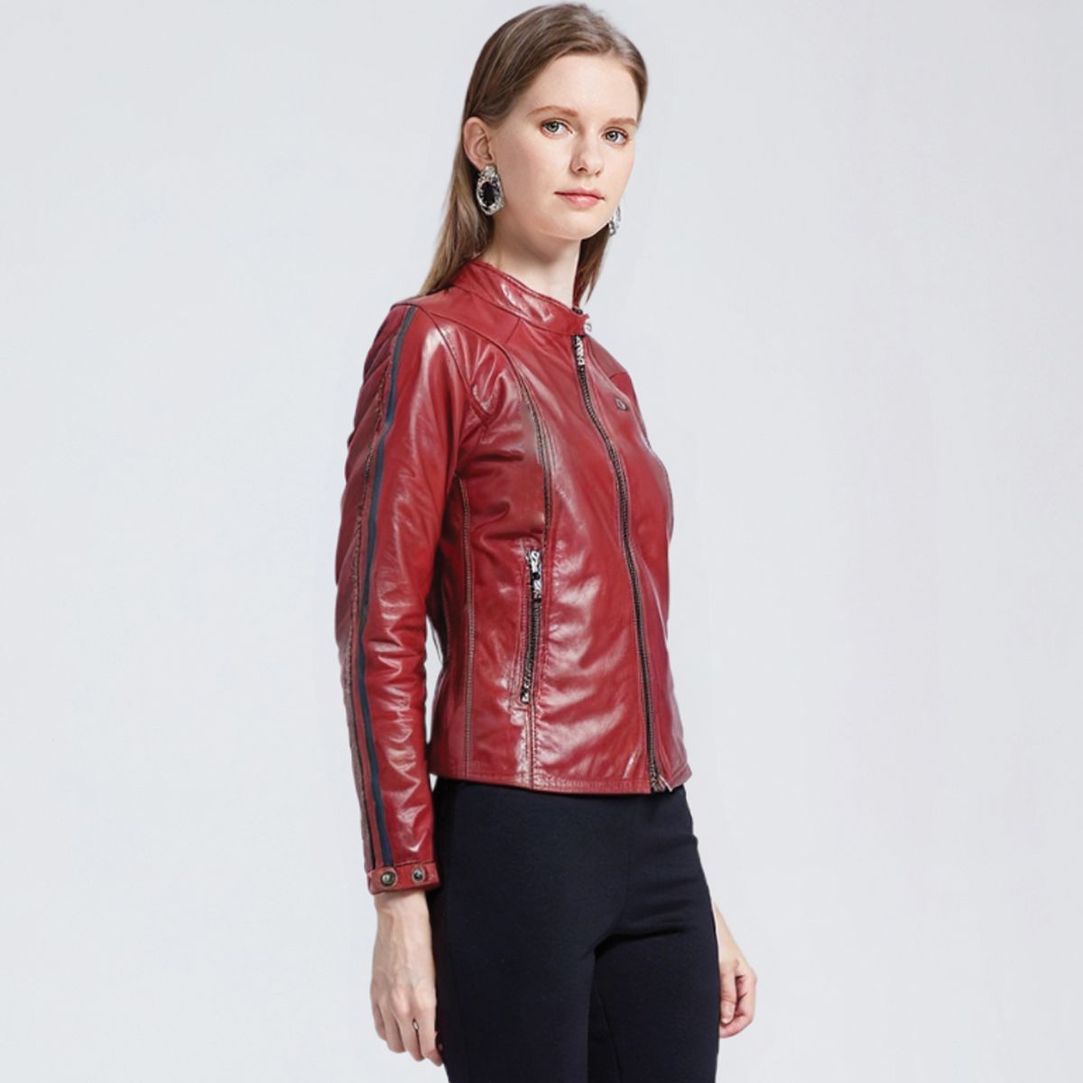 This short piece is an essential part of the feminine wardrobe, as its simplicity and elegance bring both poise and charisma. Crafted from soft, comfortable goatskin leather, this design combines colors and shapes that give the ensemble a sporty look. It features multiple pockets as well as tightening tabs with snap adjusters.